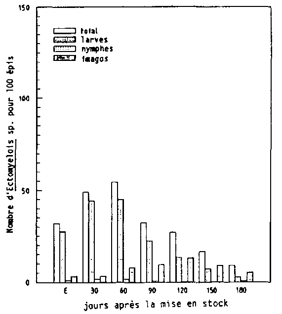 On a observé au cours des deux premiers mois de la grande saison de stockage une progression de 74 % du nombre des teignes, ce nombre passant de 31,9 à 54,5 teignes pour 100 épis. Plus de 80 % de l'ensemble des formes se trouvaient encore au moment de cette phase au stade larvaire. Après le point maximum d'infestation, intervenu au 60ème jour après la ME l'intensité de l'infestation a décru de manière continuelle jusqu'au 180ème jour après la ME, pour descendre à cette date à 9,0 Ectomyelois sp. pour 100 épis. Au fur et à mesure du recul de l'infestation, le nombre des larves a diminué au profit de celui des imagos.