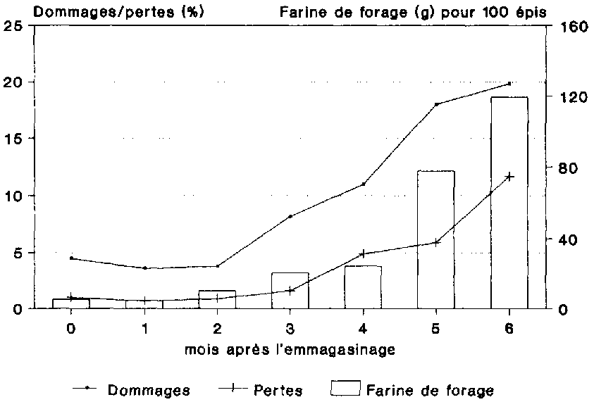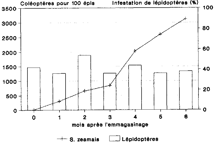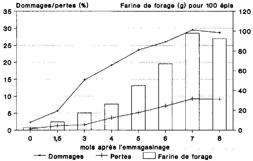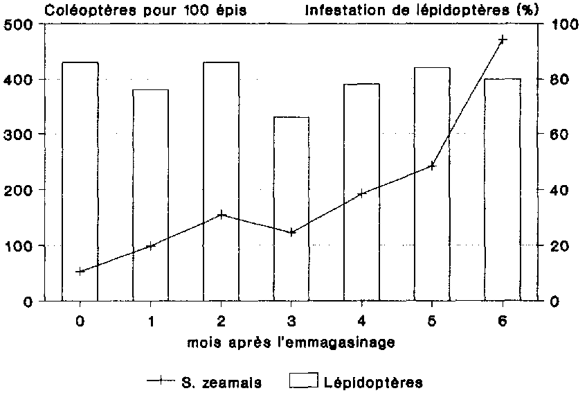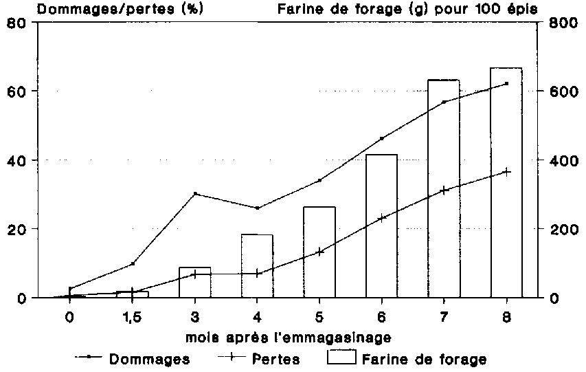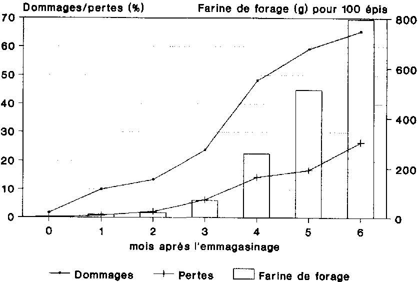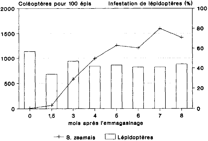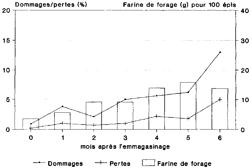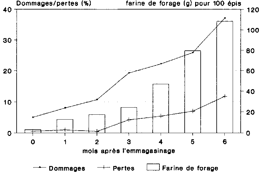 L'infestation due aux lépidoptères se traduisait dans les quatre greniers par un niveau uniforme de 40 à 30 % d'épis endommagés.