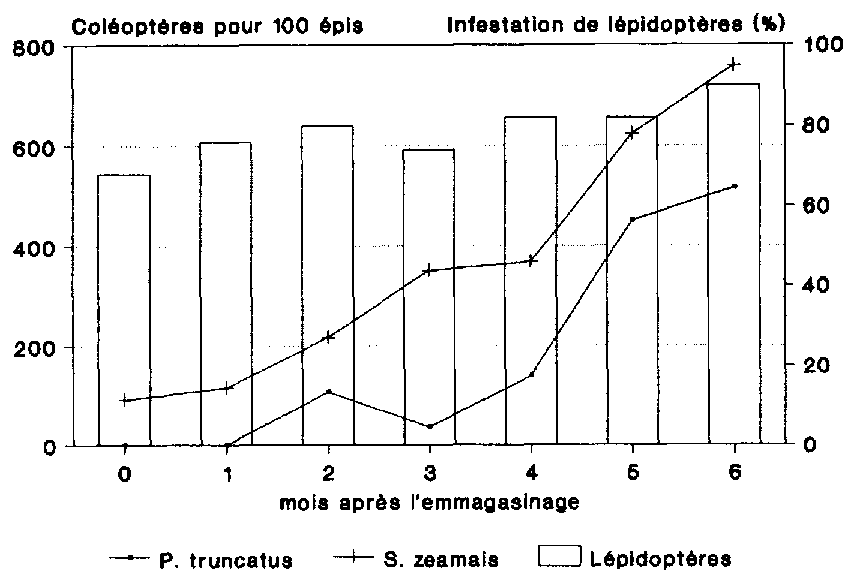 A Davié, l'infestation par P. truncatus n'a manifestement débuté que beaucoup plus tard. Les premiers coléoptères ont été découverts au bout de quatre mois seulement, le ravageur étant d'autant moins abondant à la fin de la période d'observation. Il faut cependant noter que la population a fortement évolué en deux mois, puisque l'on a trouvé au sixième mois de stockage 1 008 coléoptères pour 100 épis.