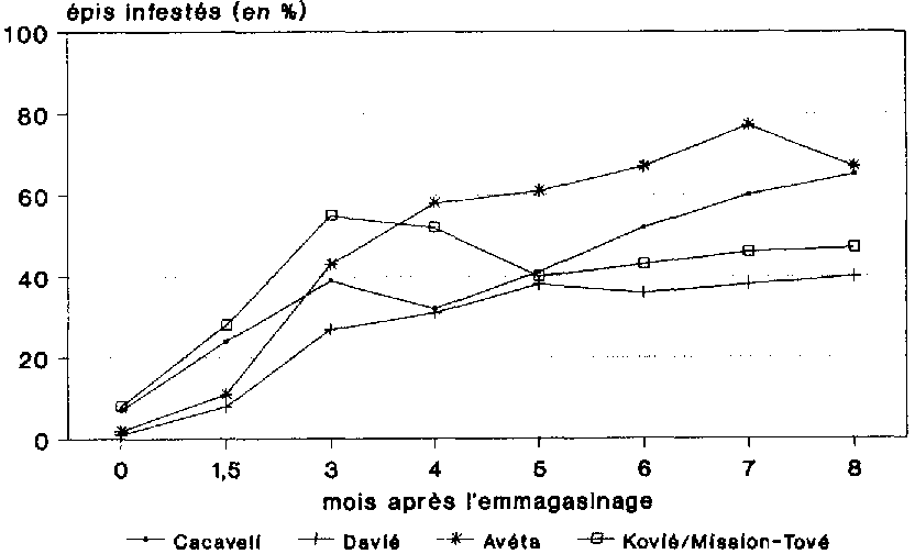L'infestation des épis de maïs par des lépidoptères sur les sites de Cacaveli, Davié et Kovié/Mission-Tové atteignait en moyenne de 40 à 60 % (fig. 1 et 2). Les valeurs élevées enregistrées à Cacaveli à la fin de la saison de stockage sont vraisemblablement dues à un problème d'identification. En cas de très forte infestation par P. truncatus, il devient en effet difficile d'établir un bilan précis des dégâts dus aux lépidoptères. Sur le site d'Avéta, l'infestation de lépidoptères était beaucoup moins élevée, puisqu'elle n'atteignait ici que 20 à 25 % environ.