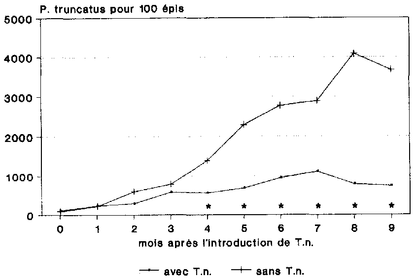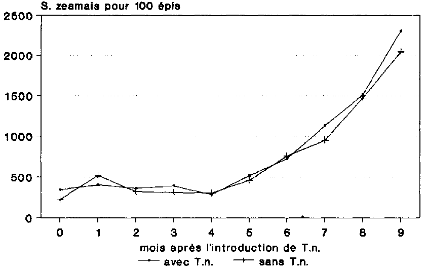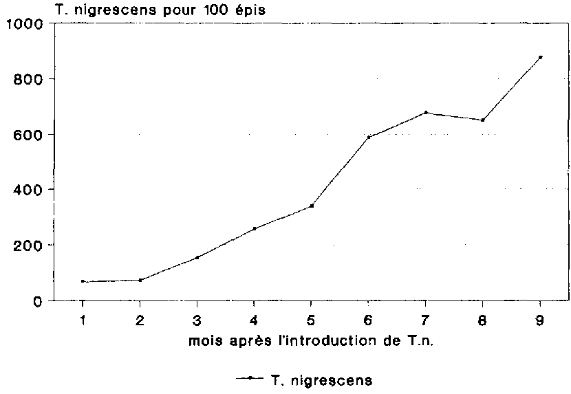 T. nigrescens n'a eu visiblement aucune difficulté majeure à s'adapter à son nouvel environnement (fig. 19). La population n'a cessé de s'accroître pendant toute la durée de l'essai, parvenant au bout de 9 mois à une densité moyenne de 876 individus adultes pour 100 épis.