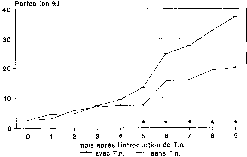 Parties d'un chiffre de 3 %, les pertes n'ont progressé que faiblement dans les deux variantes au cours des trois premiers mois qui ont suivi l'introduction du prédateur, passant alors à 7 % (fig. 22). Par la suite, les pertes enregistrées dans les greniers à maïs où le prédateur était absent ont augmenté beaucoup plus fortement que dans la variante impliquant T. nigrescens. Cette évolution s'est poursuivie jusqu'à la fin de la période d'observation. Au bout de 9 mois d'essai, on a relevé dans le témoin des pertes de MS de 37,2 %.