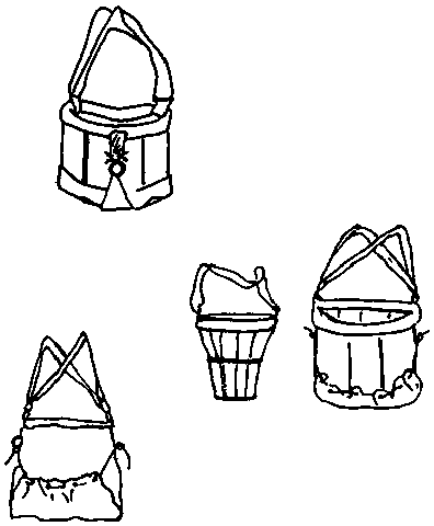 On trouve des paniers, sacs et seaux de récolte de formes et tailles très diverses. Pour fabriquer ces conteneurs de récolte, on peut coudre des sacs ouverts aux deux bouts, ajuster du tissu au fond ouvert de paniers déja faits, équiper des sacs de courroies réglables, ou tout simplement ajouter des sangles de transport à un petit panier. Voir les quelques exemples illustrés ci-dessous.