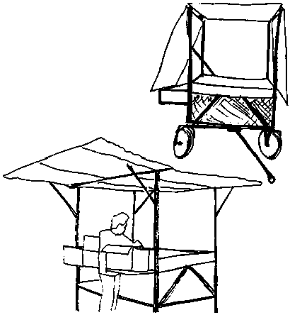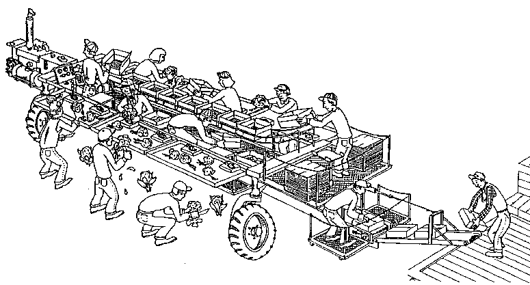 Les ouvriers chargés du conditionnement en plein champ trouveront utile cette simple charrette. Elle est munie d'un râtelier pour les caisses et d'un toit pour abriter du soleil la cueillette. La charrette est conçue pour être poussée le long du bord extérieur du petit champ où se fait la récolte.