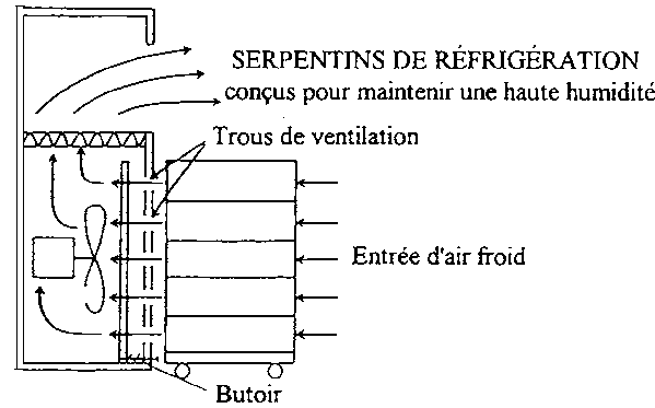 L'illustration ci-dessous montre deux types de refroidisseurs par ventilation forcée Chacun est équipé d'un ventilateur pour faire circuler l'air de la chambre froide à travers le produit en boîte.