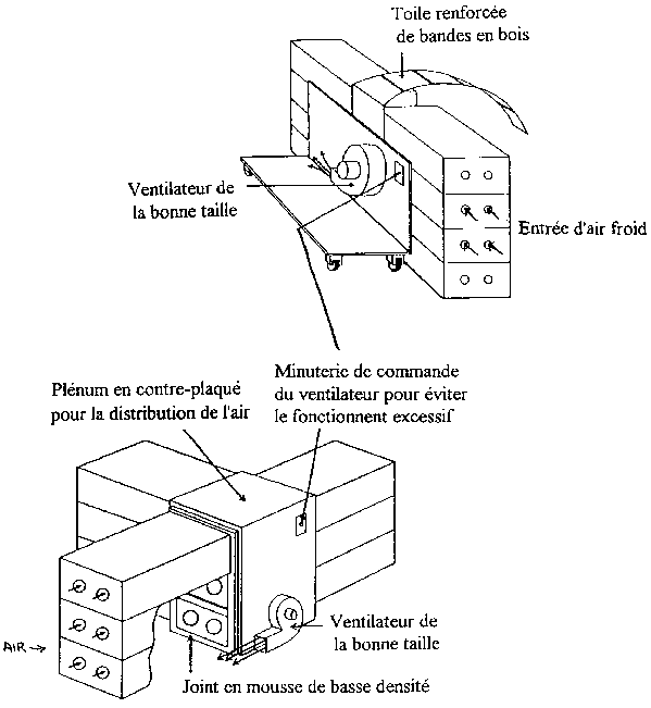 On peut construire un refroidisseur par ventilation forcée portatif en employant une bâche ou une feuille de polyéthylène. La feuille est enroulée au-dessus et derrière les boîtes sur le sol, isolant l'appareil et forçant l'air à travers les trous de ventilation (la surface de ventilation doit représenter au moins 5% de la surface du carton) des cartons empilés contre le refroidisseur. Cet appareil est conçu pour être employé à l'intérieur d'un entrepôt réfrigéré.