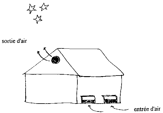 Les murs d'un hangar de conditionnement illustré ci-dessous sont faits de grillages métalliques et contiennent du charbon de bois. En humectant le charbon de bois avec de l'eau chaque matin, on refroidit la structure par évaporation pendant la journée.
