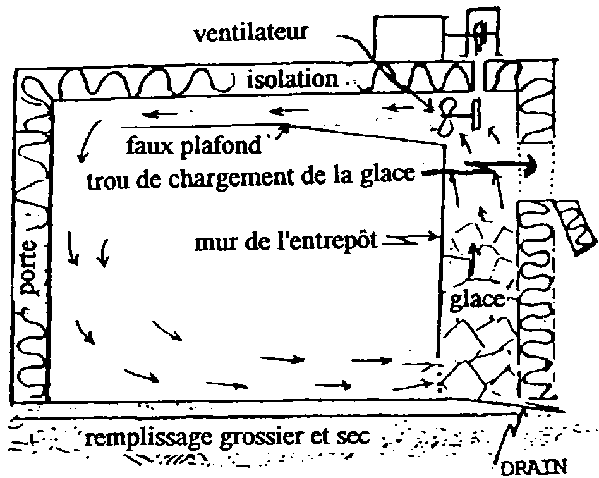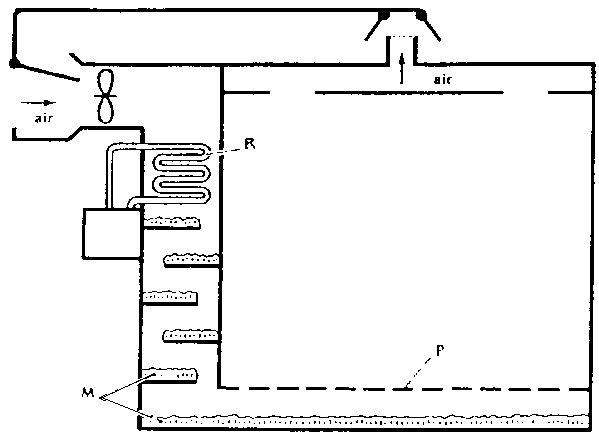 Pour un système plus durable de haute humidité relative dans l'environnement de stockage, on peut augmenter l'humidité de l'air réfrigéré. Un ventilateur fait circuler l'air sur les serpentins d'évaporation du réfrigérateur (R) puis sur de la mousse ou de la paille humide (M). On fait ensuite circuler l'air humide dans l'entrepôt par un mur perforé (P).