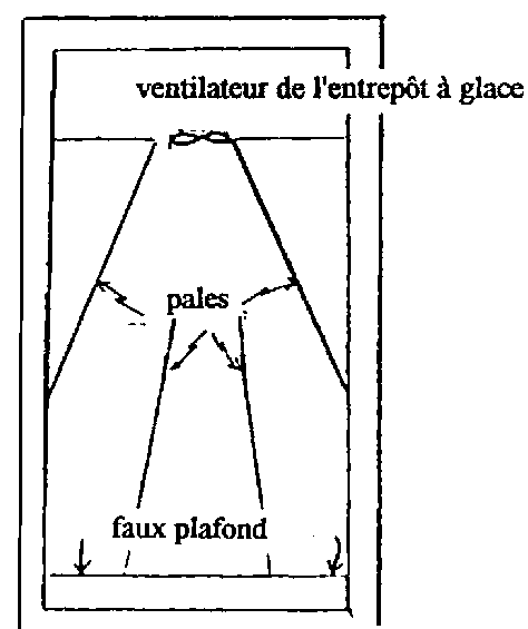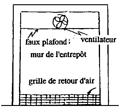 Arrière de la pièce - un moteur de ventilateur électrique est en général monté à l'intérieur de la chambre froide, la capacité du ventilateur doit être au moins égale au volume de la pièce vide (plus est mieux)