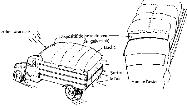 Il est souhaitable de refroidir les chargements ouverts chaque fois que possible. On peut construire un dispositif de ventilation pour camion pour un véhicule ouvert non réfrigéré en recouvrant la charge lâchement par une bâche et en fabriquant un capteur de vent à partir d'une feuille de métal. L'admission d'air doit être montée à l'avant du plateau et doit être un rien plus haut que la cabine du véhicule. Des vitesses rapides et/ou de longues distances de transport peuvent causer le séchage excessif du produit.