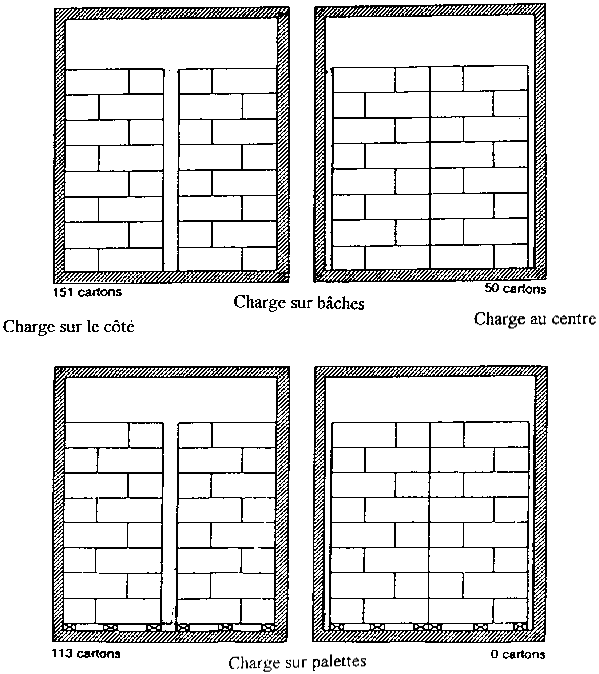 Quand on charge des cartons de tailles différentes ensemble, les récipients les plus grands et les plus lourds doivent être placés dans le fond. Il faut laisser des canaux parallèles pour permettre la circulation de l'air sur toute la longueur du chargement.