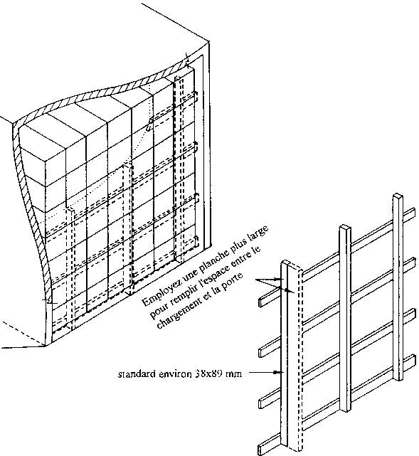 Il doit toujours y avoir un vide entre la dernière pile de produits fermiers et l'arrière du véhicule de transport. La charge doit être arrimée pour éviter qu'elle ne glisse vers la porte arrière pendant le transport Si la charge bouge, elle peut bloquer la circulation d'air, et les cartons tombés peuvent présenter un grand danger pour les travailleurs qui ouvrent la porte au marché de destination Une simple armature en bois peut être construite et installer pou éviter les dégâts pendant le transport.