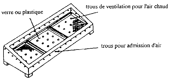 L'air chauffé dans le collecteur est forcé à travers le plancher perforé du bac de séchage. Les parois supérieures du bac, sous le surplomb du toit, sont faites de grillage, permettant une bonne circulation d'air.