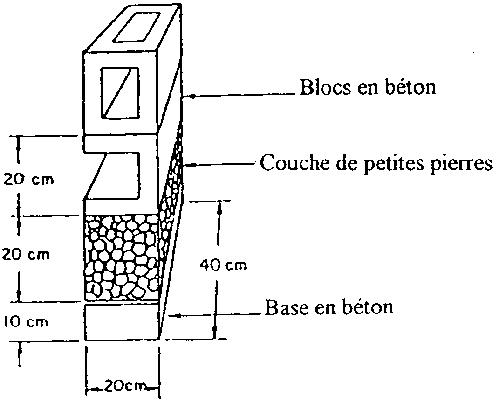 Le séchoir solaire pour copeaux de manioc illustré ci-dessous consiste d'un collecteur solaire, d'un ventilateur et d'un bac de séchage. Le collecteur solaire est construit sur une base en béton, constitué d'une couche de petites pierres et de deux couches de blocs en béton, le tout recouvert de polyéthylène.