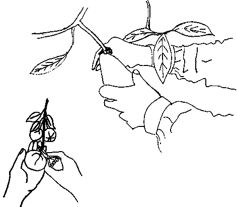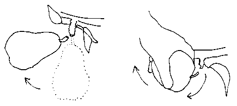 En algunos cultivos existe una zona de desprendimiento natural entre el pedúnculo del fruto y el tallo o rama de la planta o árbol cuando el producto está maduro. El recolector deberá asir la fruta firme pero suavemente y tirar hacia arriba como se muestra en la siguiente ilustración. Los recolectores deberán usar guantes de algodón, recortarse las uñas y no usar anillos o joyas para reducir los daños fisicos al producto durante la cosecha.