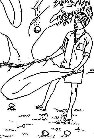 Los árboles frutales que no provienen de injerto, también llamados de pie franco, son generalmente bastante altos, por lo que si la fruta cae al suelo en el momento de cortarla se afanará severamente. Si dos cosechadoras trabajan juntos, uno puede cortar la fruta subido en la copa del árbol y el otro, con la ayuda de un saco, puede interceptar el fruto en su caída. El trabajo del recolector consiste en sujetar el saco con las dos manos y un pie, interceptar el fruto en su caída y entonces alargar el extremo de la bolsa para que la fruta pueda rodar suavemente hasta el suelo.