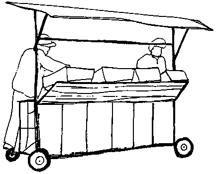 Una ayuda sencilla para los empacadores de campo es este carro móvil con una rejilla que sirve de base para las cajas y un techo que proporciona sombra. El carro está diseñado para ser empujado a lo largo de la orilla de los campos de cultivo que se están cosechando y que no son de gran tamaño.