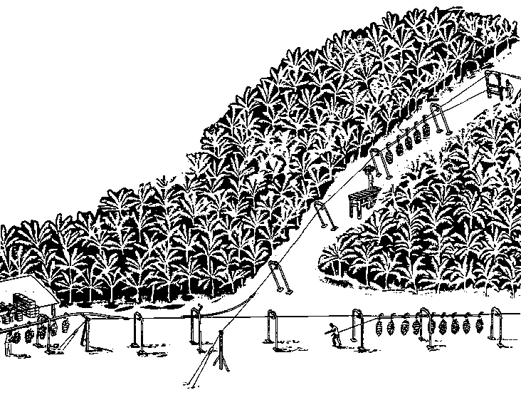 Cuando el cultivo se cosecha a cierta distancia de la empacadora, el producto debe ser transportado antes de acondicionarse. El sistema transportador movido por gravedad que se utiliza para las bananas, y que a continuación se ilustra, es un ejemplo de cómo el manejo puede minimizarse durante la preparación para el mercadeo. Los racimos de banana cosechados se llevan a las plataformas dispuestas a lo largo de toda la linea transportadora y entonces se alzan y se cuelgan mediante unos ganchos unidos al cable. La velocidad de transporte es controlada por los operarios que conducen el producto a la empacadora localizada en la parte inferior del terreno inclinado o de la pendiente.