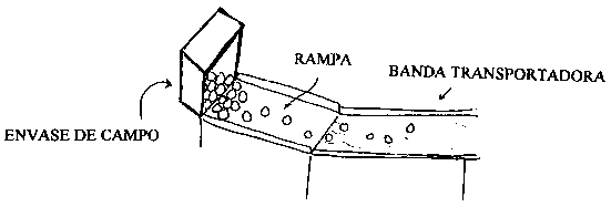 Cada vez que el producto es transvasado de un recipiente a otro se deberán de tomar las precauciones necesarias para reducir el daño mecánico. Cuando se descarga el producto de los arcones (bins) de campo o de los vehículos de transporte dentro de la empacadora, se puede practicar un vaciado en seco o en agua. Cuando se vacian en seco, los recipientes deberán vaciarse lenta y suavemente sobre una rampa inclinada con los lados acolchados. En la siguiente ilustración una banda transportadora conduce el producto seco para su acondicionamiento.