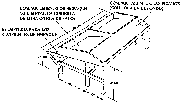 Fuente: PHTRC. 1984. A portable sorting sable Appropriate Postharvest Technology 1 (1): 1-3 (Post-Harvest Training and Research Center, Department of Horticulture, University of the Philippines at Los Banos).