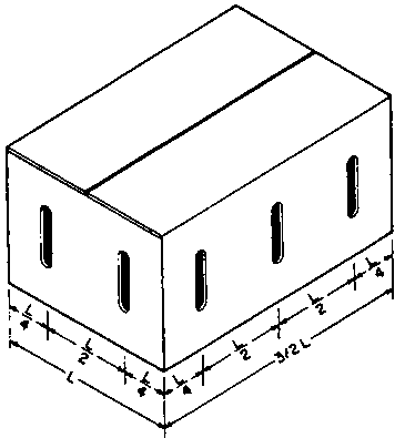 La siguiente ilustración muestra el patrón de ventilación recomendado para las cajas de cartón empleadas en el enfriamiento de la mercancía en cámara refrigerada convencional o por aire forzado. Las ventanas deberán constituir un 5% del área total de la superficie y estar localizadas a una distancia de las esquinas de 5.1 a 7.6 cm. Pocas ventanas grandes (0.5 pulgada (1.27 cm) o más) son mejores que muchas pequeñas.