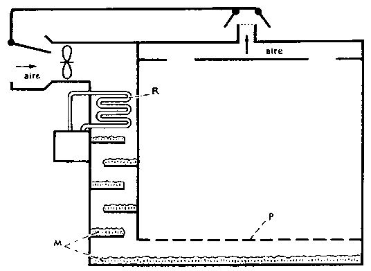 El aire refrigerado tiende a bajar la humedad relativa que es benéfica para el almacenamiento de la mayoría de las cosechas hortícolas. El método más sencillo para aumentar la humedad relativa del aire del almacén consiste en mojar el suelo de la cámara, o humectar los recipientes o los empaques con agua fría y dejar que se evapore. Para un sistema más permanente de humedad relativa alta en el ambiente del almacén, puede añadirse humedad al aire refrigerado. Para ello el aire impulsado por el ventilador y que circula alrededor del serpentín del evaporador (R), se hace pasar por paja o musgo mojado (M). El aire así humedecido es entonces impulsado hacia el cuarto de almacenamiento a través de una pared perforada (P).