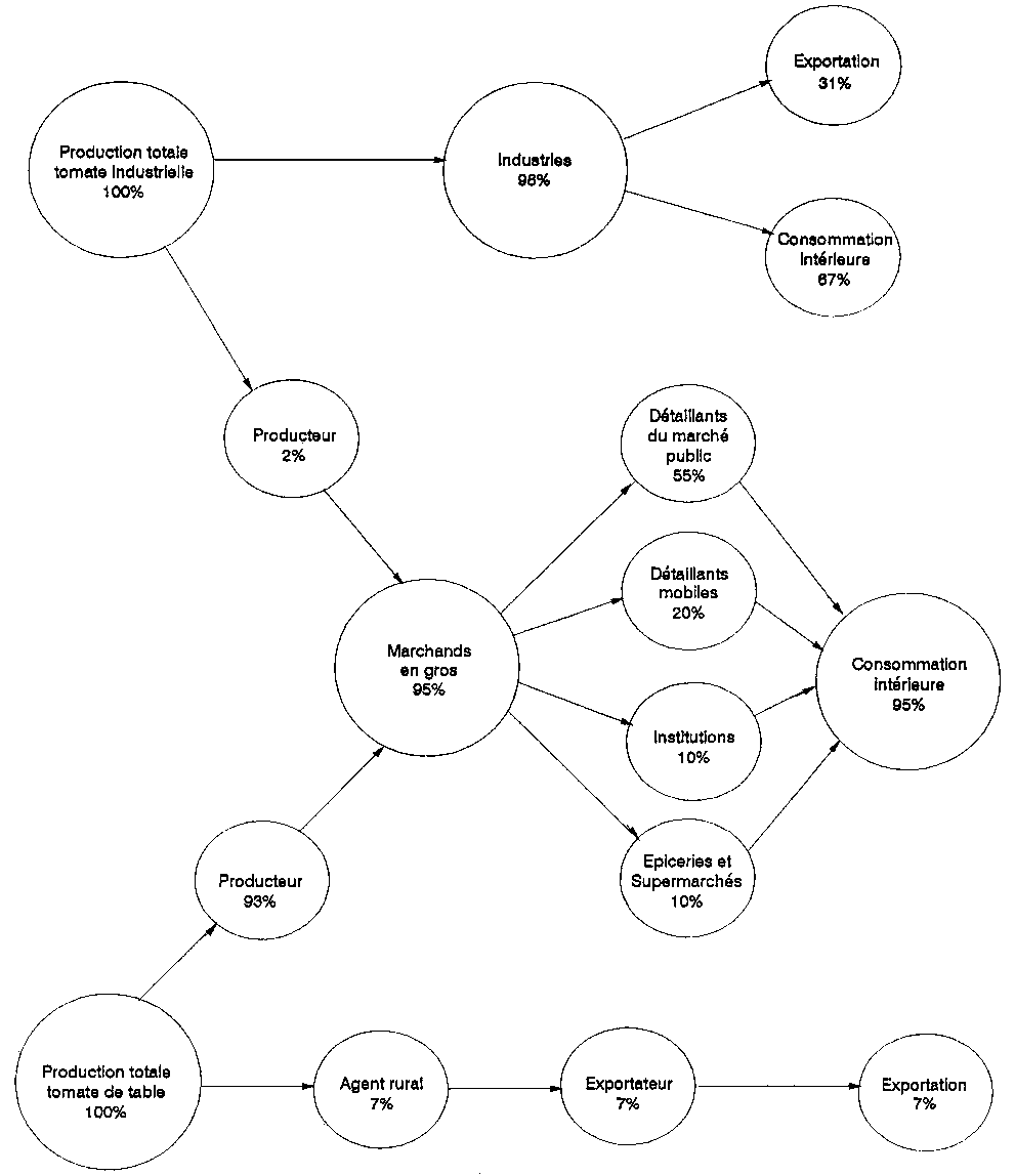Au cours des derniers trente ans, les domaines des sciences sociales, de la technologie alimentaire et de l'économique ont contribué des méthodes et des instruments d'une grande utilité pour l'analyse des filières alimentaires. Etant donné les points de vue et les objectifs différents de chacune de ces disciplines, l'on ne devrait pas s'étonner de ce que leurs techniques de recherche et leurs méthodes de présentation des données varient quelque peu entre elles. Par exemple, en présentant un organigramme d'une filière de commercialisation d'un produit donné, l'expert dans les sciences sociales aura tendance à mettre en relief l'élément humain (Figure 2.1 A), tandis que le technologiste alimentaire soulignera l'aspect technique (Figure 2.1 B), et l'économiste signalera le côté institutionnel (Figure 2.1 C). Aucune des trois méthodes n'est nécessairement plus juste que les autres; chacune n'est qu'un moyen de faciliter la compréhension d'un système complexe vu d'un point de vue particulier.