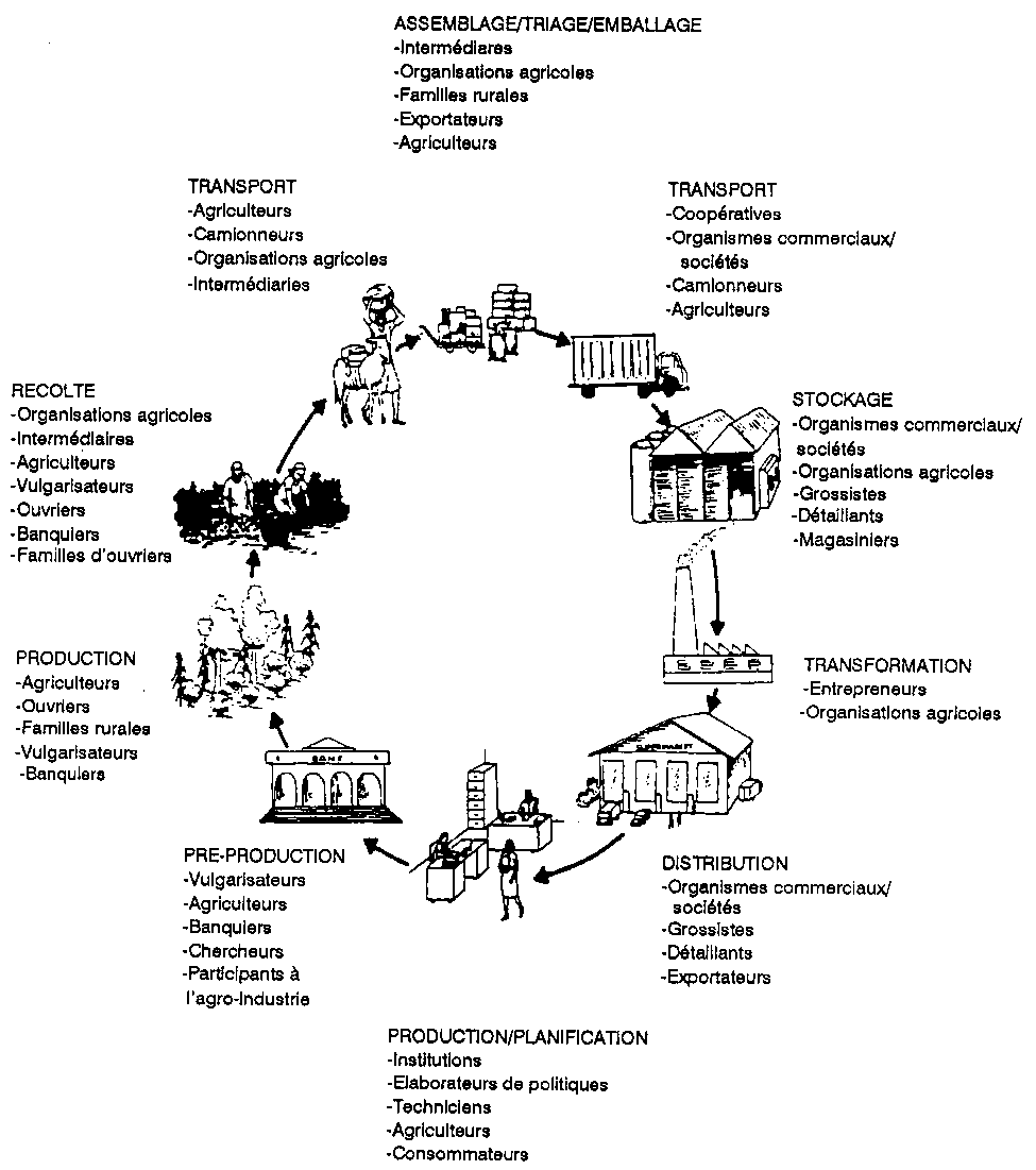La Figure 2.2 signale non seulement les points clef dans une filière, mais aussi les diverses catégories de participants qu'on rencontre à différents points dans la plupart des filières. Ces participants comprennent des individus tels que les fermiers, les camionneurs et les intermédiaires commerciaux, aussi bien que des institutions telles que les ministères d'agriculture, les organisations agricoles, et les conseils de commercialisation. Les participants varient selon le produit, le pays et les circonstances particulières.