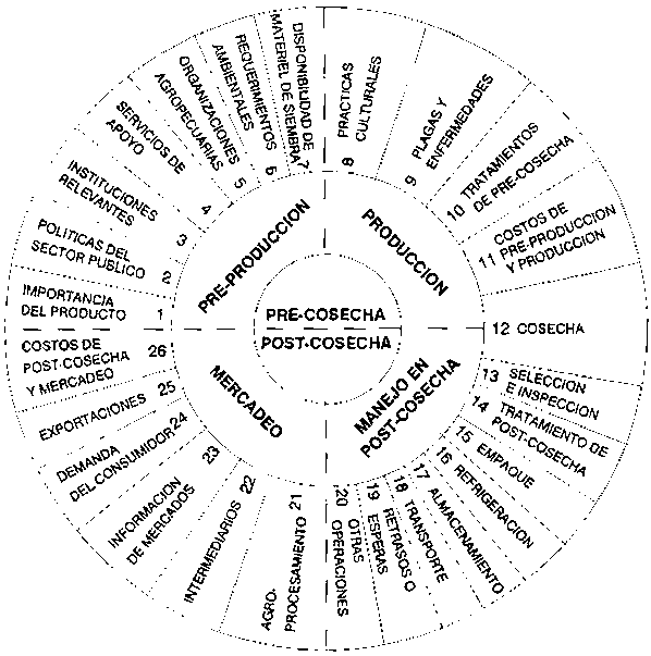 Los 26 componentes de la Figura 3.1 se presentan en un formato circular. La parte central del círculo está dividida en dos, identificando aquellos componentes que corresponden al período de pre-cosecha y aquellos de post-cosecha. Cada semi-círculo está a su vez dividido para indicar si los componentes tienen relación con: