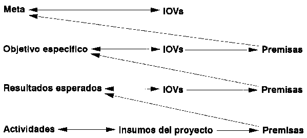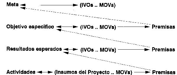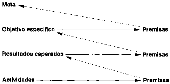 Si las premisas relacionadas con las actividades a ser implementadas son correctas, entonces se alcanzarán el nivel superior siguiente, los resultados esperados. Igualmente, si las premisas correspondientes a los resultados esperados son correctas, se alcanzará entonces el objetivo específico. Finalmente, si las premisas que corresponden al objetivo específico son correctas, entonces la meta final será alcanzada. Las premisas correspondientes a la meta, sostendrán la meta por un largo período cuando éste se alcanza. Esto demuestra la lógica vertical contenida en el Marco Lógico.