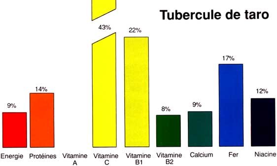 Les feuilles de taro fournissent en grande quantité la vitamine A, nécessaire à une bonne croissance, à la santé des yeux et à la prévention des maladies. Elles contiennent également de la vitamine C et de la vitamine B2 (riboflavine). La vitamine C assure la résistance des tissus, aide l'organisme à assimiler le fer et en facilite les échanges chimiques; la vitamine B2, ou riboflavine favorise elle aussi la croissance et la vue.