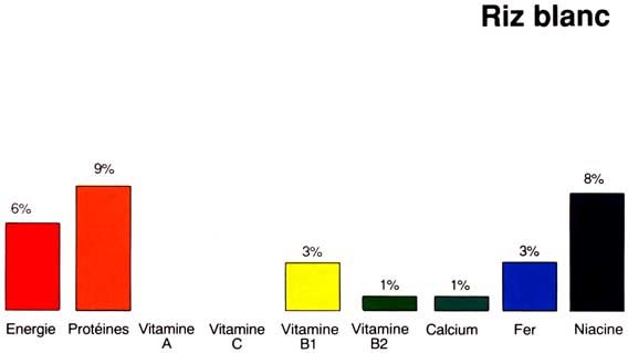L'histogramme ci-contre montre que le riz blanc apporte une certaine quantité de calories et de protéines, mais très peu de vitamines et de sels minéraux comparé aux tubercules ou aux feuilles de taro. Le riz brun, ou riz complet, contient plus d'éléments nutritifs que le riz blanc, mais il est lui aussi moins nourrissant que les tubercules ou les feuilles de taro. Le riz blanc à lui seul n'apporte pas beaucoup d'éléments nutritifs. Il faut toujours l'accompagner de légumes verts et jaunes, et de viande ou de poisson pour faire un repas complet et nourrissant.