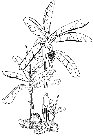 Le bulbe émet chaque année un rejet qui meurt après avoir donné sa fleur et ses fruits. Le "tronc" de l'arbre est en réalité constitué par la base des feuilles enroulées sur elles-mêmes. Les bananiers poussent bien dans tout le Pacifique Sud, même sur les atolls en général. Pour qu'ils donnent beaucoup de fruits, ils doivent être bien entretenus et pas trop serrés. L'illustration de gauche montre comment les éclaircir. On les plante en mettant en terre des bulbes ou des rejets prélevés sur la base des arbres plus anciens. La fructification a lieu environ un an après la plantation. Elle peut se produire à n'importe quel moment de l'année mais a plus de chance de se faire par temps chaud. Les bananes peuvent être cueillies lorsque les trois quarts des fruits du régime ont atteint leur taille définitive. Pour faire mûrir les bananes pendre le régime dans un endroit aéré. On utilise parfois d'autres méthodes de maturation telles que l'enfouissement sous terre ou l'utilisation de produits chimiques.
