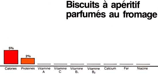 Les histogrammes ci-dessus montrent la valeur alimentaire de deux produits qui peuvent être achetés pour le même prix. La banane contient d'autres éléments nutritifs en plus des calories et des protéines, alors que les biscuits à apéritif parfumés au fromage et vendus dans des sachets aux couleurs vives ne contiennent ni les vitamines, ni les sels minéraux qui sont si importants. Mieux vaut donc acheter des bananes puisque, pour la même somme d'argent, on a un aliment plus nutritif.