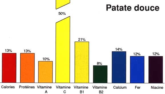 Les tubercules de la patate douce constituent une bonne source de calories dont l'organisme a besoin et qui donnent vitalité et énergie. Les variétés à tubercules jaunes et oranges ont une teneur élevée en vitamine A. Cette vitamine importante ne se retrouve qu'en quantité limitée dans les variétés à chair claire.