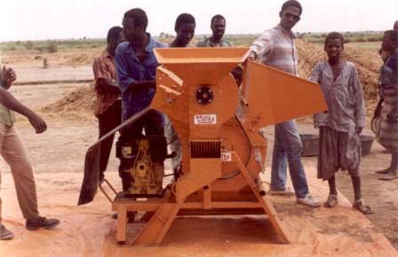 Batteuse Votex de 400 kg/h (moteur diesel, auxiliaire de vannage). Novembre 1989, Vallée du fleuve Sénégal
