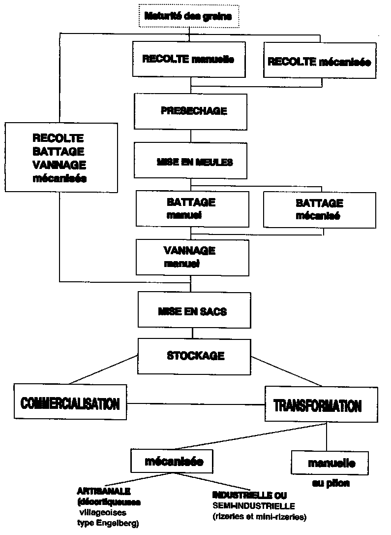 Le schéma de la page suivante présente les systèmes après-récolte en vigueur dans la vallée, en partant du niveau de maturité des grains. Deux systèmes existent, l'un est manuel (chaîne centrale) et l'autre partiellement ou totalement mécanisé depuis la récolte (moissonneuses-batteuses) jusqu'à la transformation (rizeries). Selon les zones de la vallée, la mécanisation se développe différemment, d'où la nécessité d'aborder les problèmes de qualité du riz en tenant compte de cette diversité.