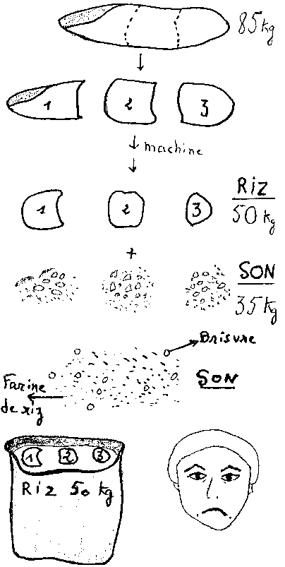 · CONSEQUENCES: LE POIDS DE RIZ BLANC VENDU SERA INFERIEUR ET IL GAGNERA MOINS D'ARGENT.