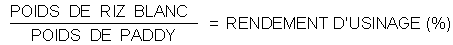 Le rendement d'usinage représente la QUANTITE DE RIZ BLANC obtenue après décorticage/blanchiment d'une QUANTITE DE DEFINIE DE PADDY PROPRE. On l'exprime en %.