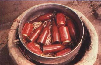 61. Une fois capsulées, les bouteilles sont stérilisées dans une marmite avec de la paille, une grosse pierre et de l'eau que l'on va laisser bouillir 45 minutes, comme pour les conserves de tomates pelées.