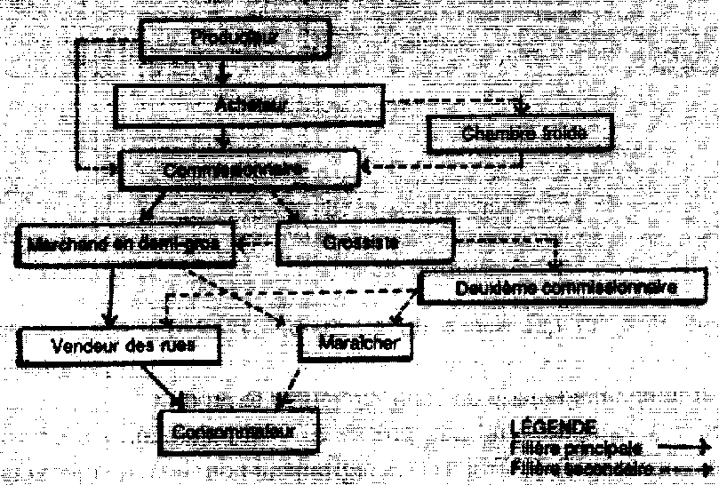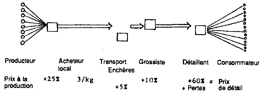 Il est essentiel de bien comprendre la première étape de la filière, c'est-à-dire le rapport entre le producteur et l'acheteur. Pour comprendre le système il est utile de dresser un organigramme montrant les différentes étapes de la filière de distribution.