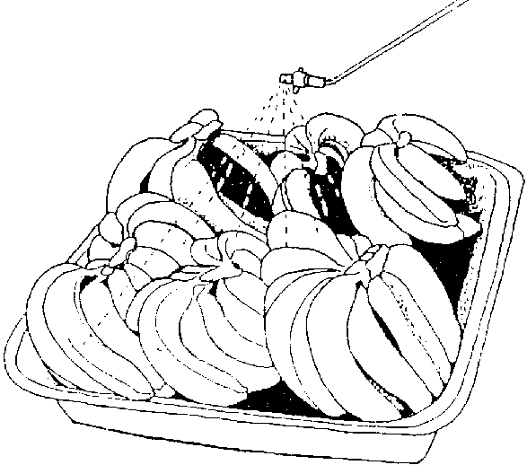 Cuando han de rociarse grandes cantidades de productos puede recurrirse a un sencillo dispositivo mecanizado de rociado o de ducha con un mezclador mecánico para el fungicida. El producto pasa por el dispositivo en bandejas perforadas colocadas sobre un transportador de correa o de rodillos (Figura 18).