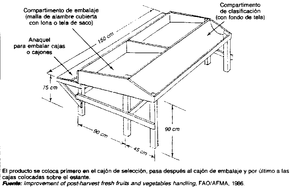 Inmediatamente antes de embalarlo conviene efectuar una última selección del producto, a fin de descartar las piezas invendibles que puedan haberse pasado por alto en selecciones anteriores. Para seleccionar, clasificar y embalar manualmente pequeñas cantidades de productos es suficiente contar con una banca adecuada (Figura 19). El tipo de banca que se muestra en la ilustración puede fabricarse de cualquier longitud, y si han de recibirse cantidades mayores de productos puede añadirse una segunda banca.