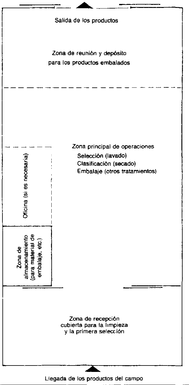 El espacio disponible afectará al diseño. En general la disposición más idónea será un edificio de una sola planta con una zona de recepción en un extremo y una zona de expedición en el otro. Se separa así la zona de recepción, que se ensucia fácilmente, de las actividades de embalaje y expedición, lo que reduce el riesgo de que se contamine el producto seleccionado y embalado. Se evita también la congestión de las instalaciones y la confusión entre los vehículos que llegan y los que parten (Figura 24). Si las dimensiones y la forma del terreno imponen limitaciones, puede adoptarse una disposición en U, con la zona de entrada al lado de la de salida, pero esa solución no es recomendable, pues creará sin duda problemas de contaminación y de congestión y dificultará la ampliación futura de las instalaciones.