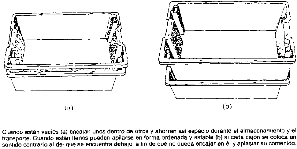 Las cajas o bandejas transportables por una persona resultan útiles para el movimiento del producto hasta el momento del embalaje. Pueden ser de madera, de plástico o, preferiblemente, de politeno de alta densidad. Las de plástico son más caras que las de madera, pero también más fáciles de limpiar, y suelen durar más (Figura 25). Pueden transportarse varias al mismo tiempo.