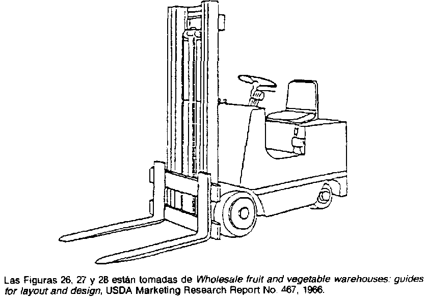 Los elevadores de carga manuales (Figura 26) son útiles en las grandes instalaciones de embalaje en las que se necesiten medios mecánicos para el movimiento de unidades de carga sobre plataforma (Figura 27); no pueden utilizarse, sin embargo, para colocar sobre vehículos las plataformas cargadas; esa operación requiere que la carga pueda levantarse hasta la caja del camión, o la utilización de un izador mecánico.