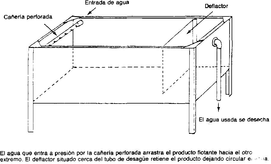 Lavado. El producto puede lavarse con agua corriente en una pila de hierro galvanizado del tipo que se muestra en la Figura 29. El agua que sale por la cañería de entrada, que está perforada por un lado, arrastrará hacia el otro extremo de la pila los productos flotantes. El deflactor vertical situado cerca del desagüe contribuirá a asegurar que todos los productos introducidos en la pila queden debidamente lavados.