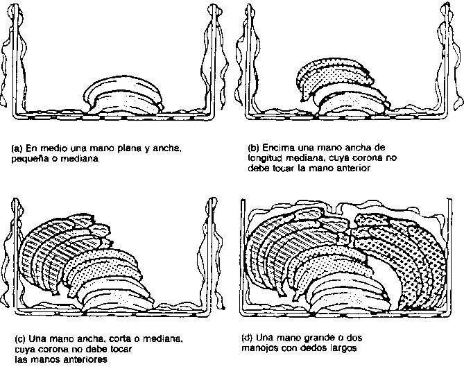 Las manos o manojos deben embalarse en cajas, con la parte curva hacia arriba, como se indica en la Figura 38, asegurándose de que las coronas de las manos colocadas encima no dañen los bananos de debajo. Las cajas tienen que estar llenas pero no en exceso; de otro modo los bananos se dañarían, pues sería la propia fruta, y no las paredes de las cajas, la que soportaría el peso de las cajas colocadas encima.