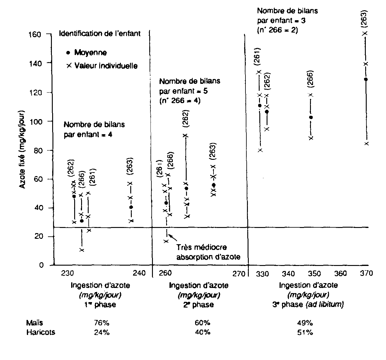 Baptist et de Mel (1955) ont obtenu une réponse très satisfaisantechez 23 enfants cingalais, de un à six ans, avec un régime mixte composé de trois céréales et de quatre légumes secs, supplémenté au lait écrémé. D'autre part, Navarrete et Bressani ( 1981 ) ont indiqué, d'après des études de bilan azoté chez les adultes, qu'un régime à base de haricots réalisait l'équilibre azoté pour une ingestion de 114 mg d'azote par kilogramme et par jour; toutefois, un mélange maïs/haricots dans la proportion 87:13 permettait de réaliser l'équilibre azoté pour une ingestion de 98 mg d'azote par kilogramme et par jour.