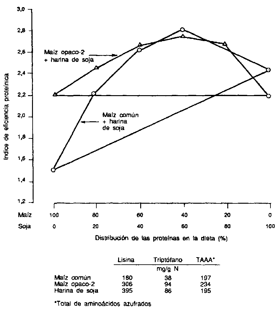 Los estudios muestran que se alcanza un PER máximo añadiendo de 4 a 6 g por ciento de proteínas de soja, ya sea de soja entera, de harina (50 por ciento), de concentrado proteico o de proteínas de soja obtenidas por aislamiento (Bressani, Elías y Braham, 1978; Bressani et al., 1981). Se analizarán los resultados conseguidos con soja entera por su mayor disponibilidad, menor costo y las aplicaciones prácticas que ofrece. En la Figura 3 se presenta el PER de diversas combinaciones de maíz común, maíz opaco-2 y harina de soja en proporciones que van de 0 a 100.